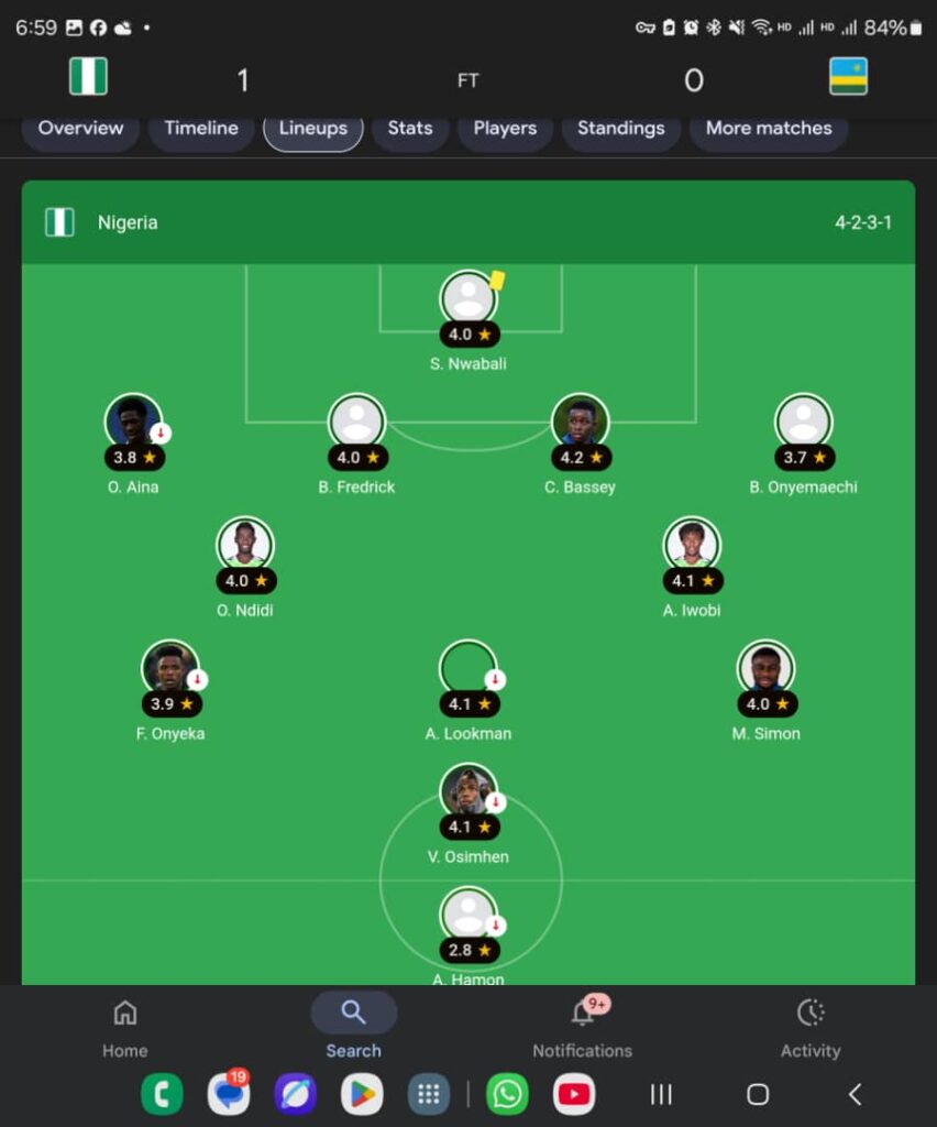 Defensively, Nigeria remained disciplined throughout. Calvin Bassey’s timely block on a Rwanda header and Stanley Nwabali’s collection of follow-up chances highlighted the team’s awareness and coordination in central areas. The fullbacks stayed disciplined, rarely overcommitting, while the midfield duo ensured that Rwanda had minimal space to initiate counters. Despite the low-scoring nature, Nigeria controlled transitions effectively, using the width of the pitch to stretch the visitors and create pockets of space.